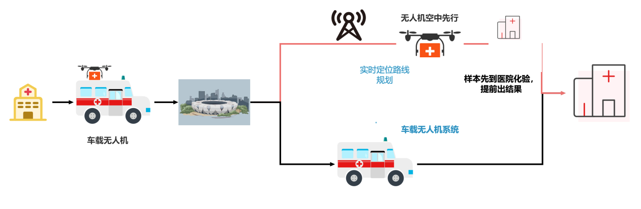 模拟杭州亚运会期间某比赛场馆内发现需要急救转运到医院的患者,救护车抵达急救现场,医生将患者血液样本采集好后通过车载无人机先行回到医院进行检验,提早为救治做准备,救护车则通过道路交通将患者送至医院(图 1)。
