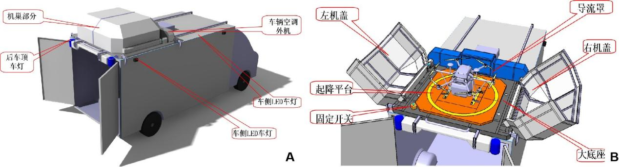 A: 无人机起飞离开机巢;B: 机巢侧面;C: 机巢内无人机停放画面;D: 机巢打开后无人机起飞前的俯视图 图 4 车载无人机平台实物图