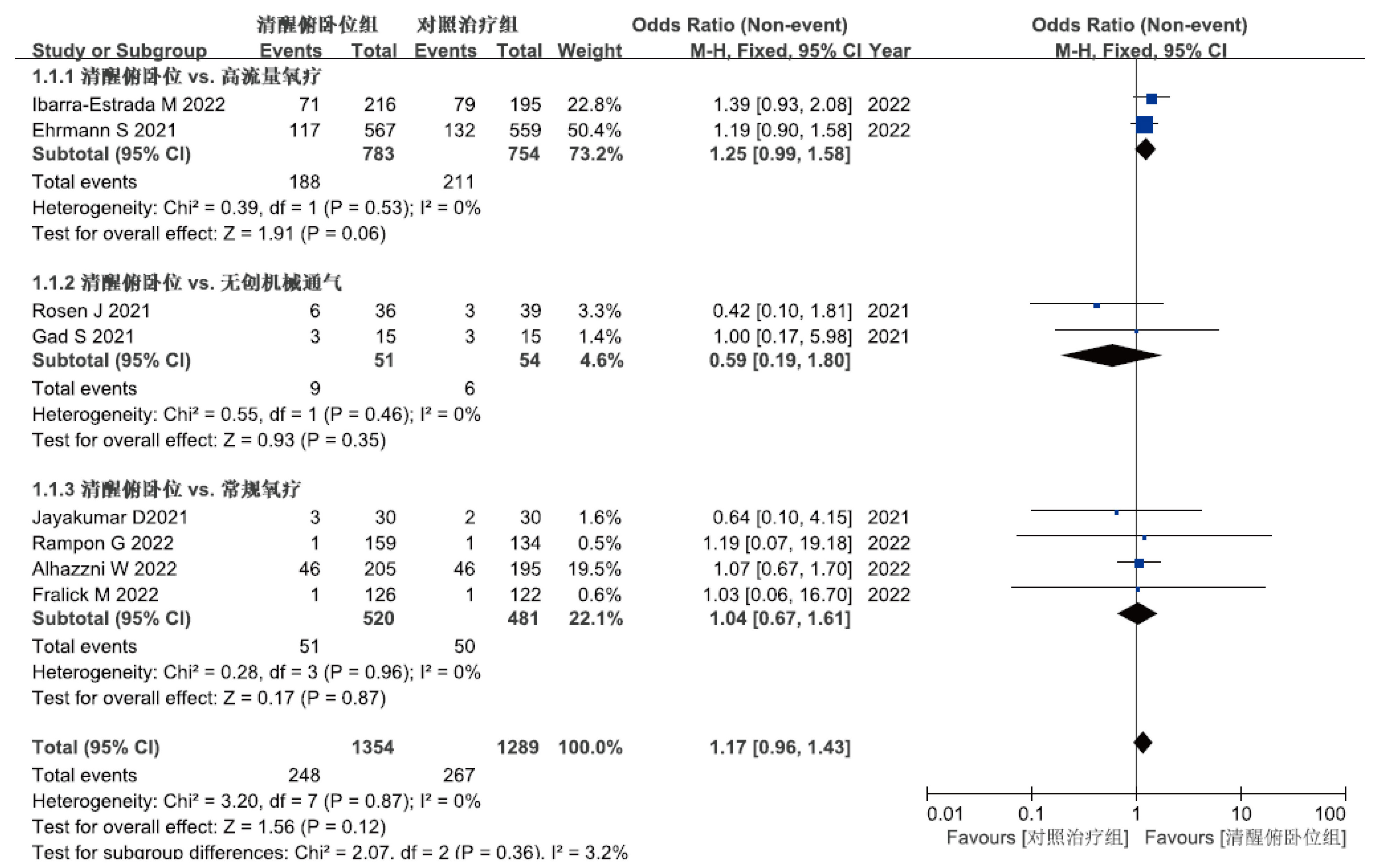 与对照治疗组相比,清醒俯卧位并未降低COVID-19患者28 d病死率,OR为1.17 (95% CI 0.96~1.43,P=0.36)。