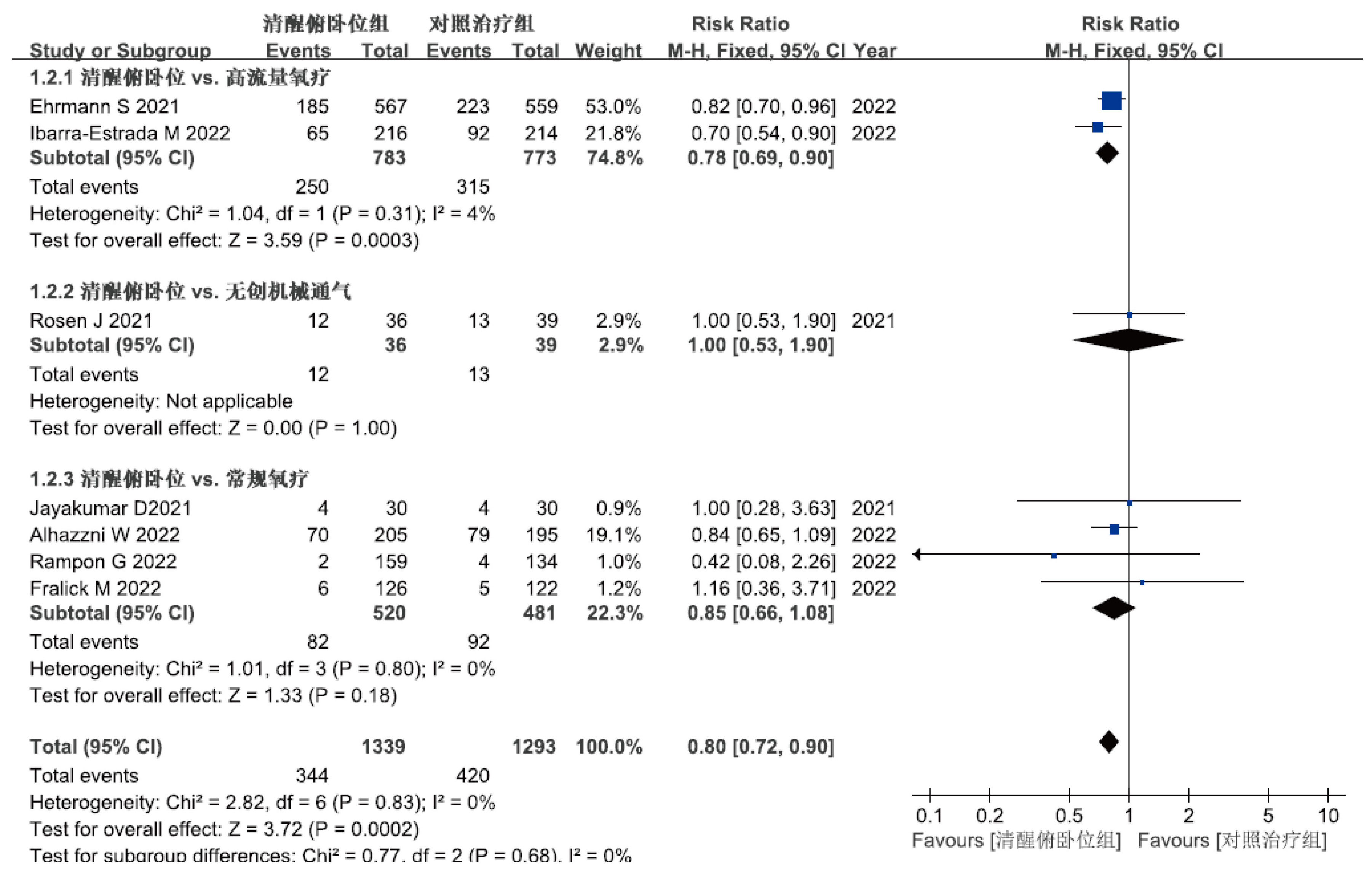 与对照治疗组相比,清醒俯卧位明显降低COVID-19患者气管插管率,OR为0.80 (95% CI: 0.72~0.90,P=0.0002)。