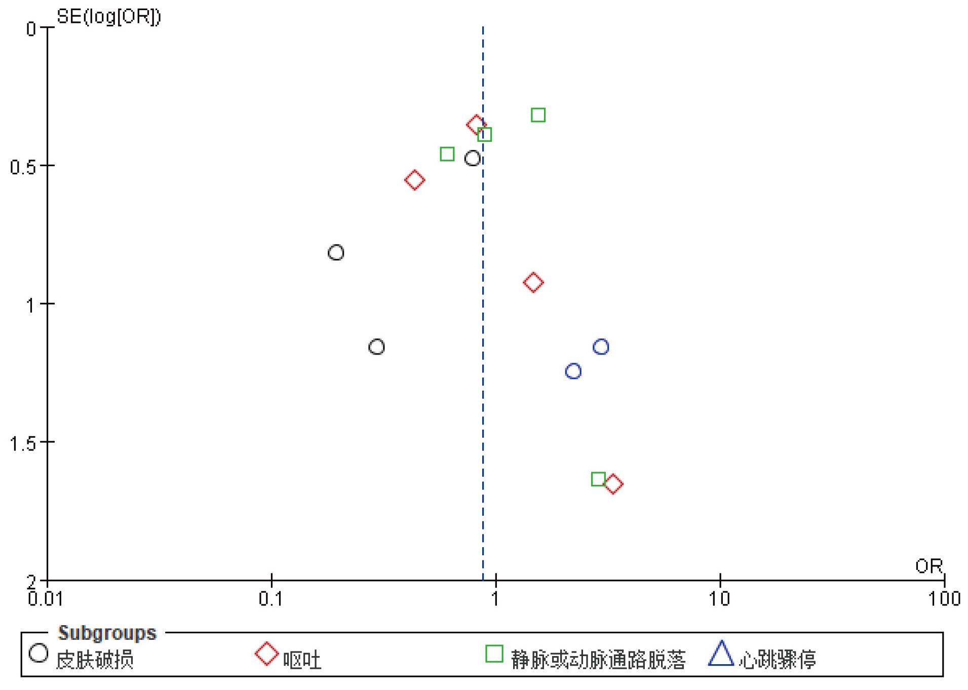 与对照治疗组相比,清醒俯卧位并未增加COVID-19患者皮肤破损、呕吐、静脉或动脉通路脱落和心搏骤停等不良事件发生率(图 5)。绘制漏斗图显示研究分布不对称,提示发表偏倚性较大(图 6)。