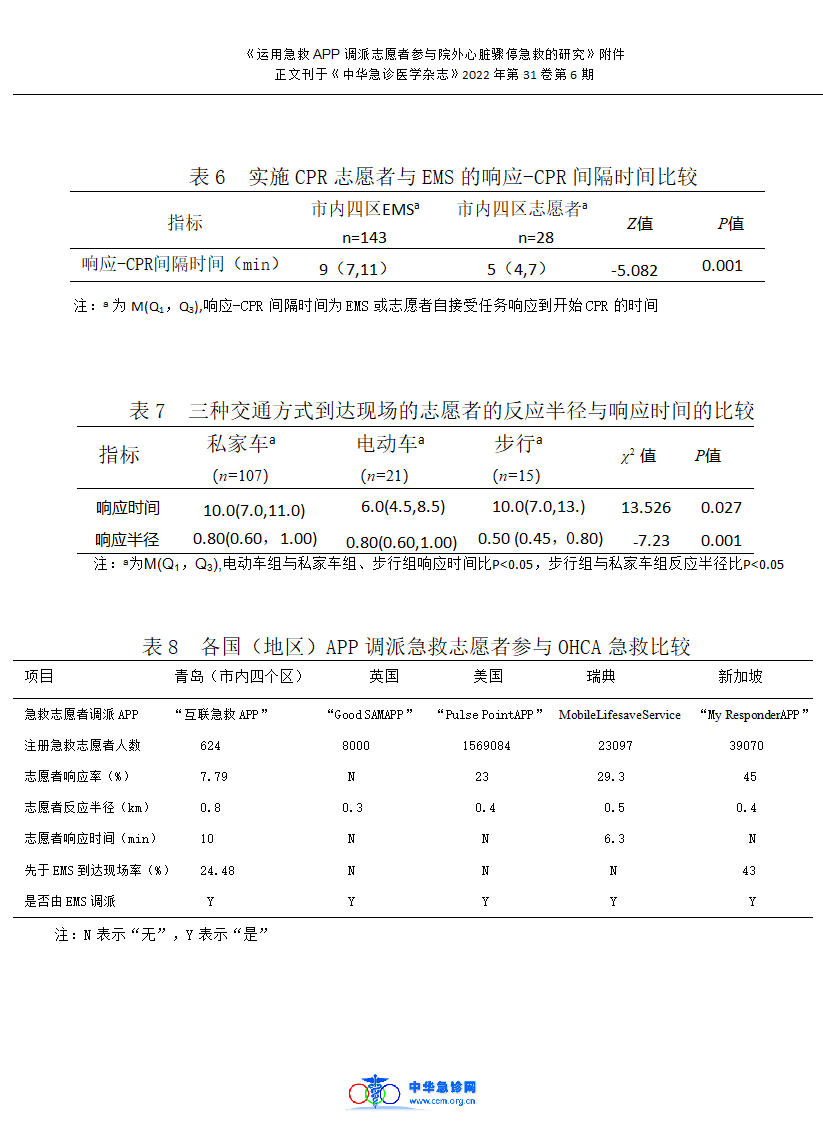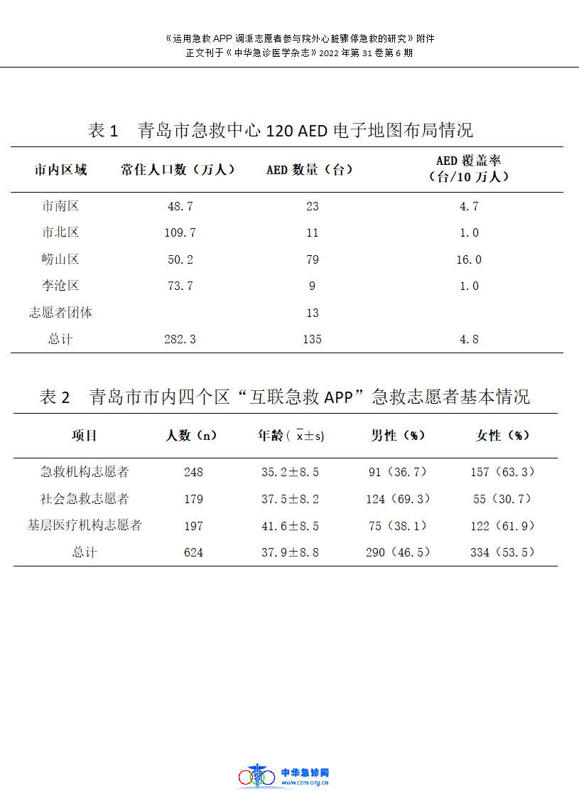 冉飘,王君业,井国防,林爱进,盛学岐,徐梅. 运用急救APP调派志愿者参与院外心脏骤停急救的研究[J]. 中华急诊医学杂志, 2022,31 (6):842-845.